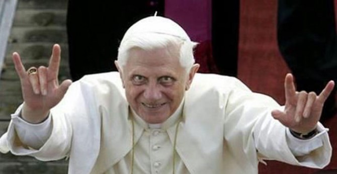 Hieronder: Politici en pausen die het duivelse handgebaar maken, waarbij de pink en wijsvinger die naar boven wijzen de hoorns symboliseren. De middelste twee vingers wijzen naar beneden. De duim kan ofwel naar buiten wijzen ofwel over de twee middelste vingers gevouwen zijn.