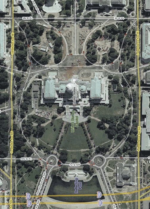 In 1791 ontwierp Pierre Charles L’Enfante (die tevens Vrijmetselaar was) het bestuurlijke centrum rond Washington DC. Zijn ontwerp betrof niet alleen de straten, pleinen en gebouwen, maar hij verwerkte tevens allerlei occulte symbolen in het Amerikaanse bestuurlijke centrum. [5] Zo is er onder andere een (omgekeerd) pentagram in de straten van Washington DC en rond het Pentagon te ontdekken. De straten en paden rond Capitol Hill creëren de liniatuur van een uil. Maar de uil is niet alleen in het stratengrid van Washington DC verwerkt, het symbool is ook ‘verstopt’ afgebeeld op het 1 dollar biljet.