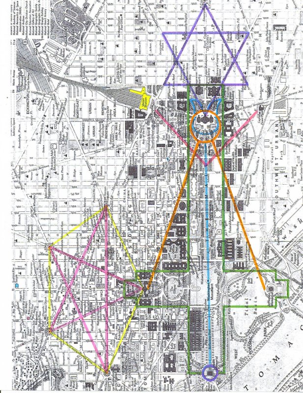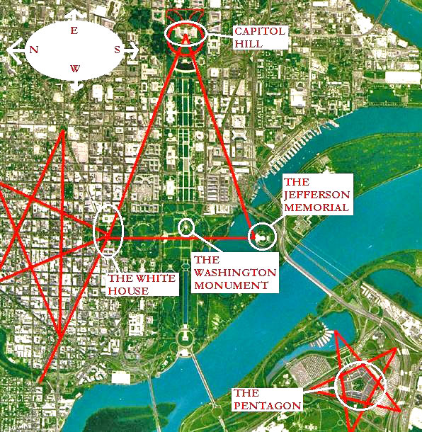 Het stratengrid in Washington DC is zodanig vormgegeven dat in de vorm van de straten, paden en pleinen occulte symbolen zijn verwerkt. Dit ontwerp stamt uit 1791, een paar jaar nadat de Vrijmetselaars in 1782 hun leiderschap van de New World Order veronderstelden. In Europa waren de occulte leiders al in 1740 door hun ‘meesters’ verteld dat het nieuwe Amerikaanse continent als het nieuwe ‘Atlantis’ gesticht moest worden. Amerika zou het wereldwijde leiderschap en sleutelrol van de New World Order op zich nemen. [5]