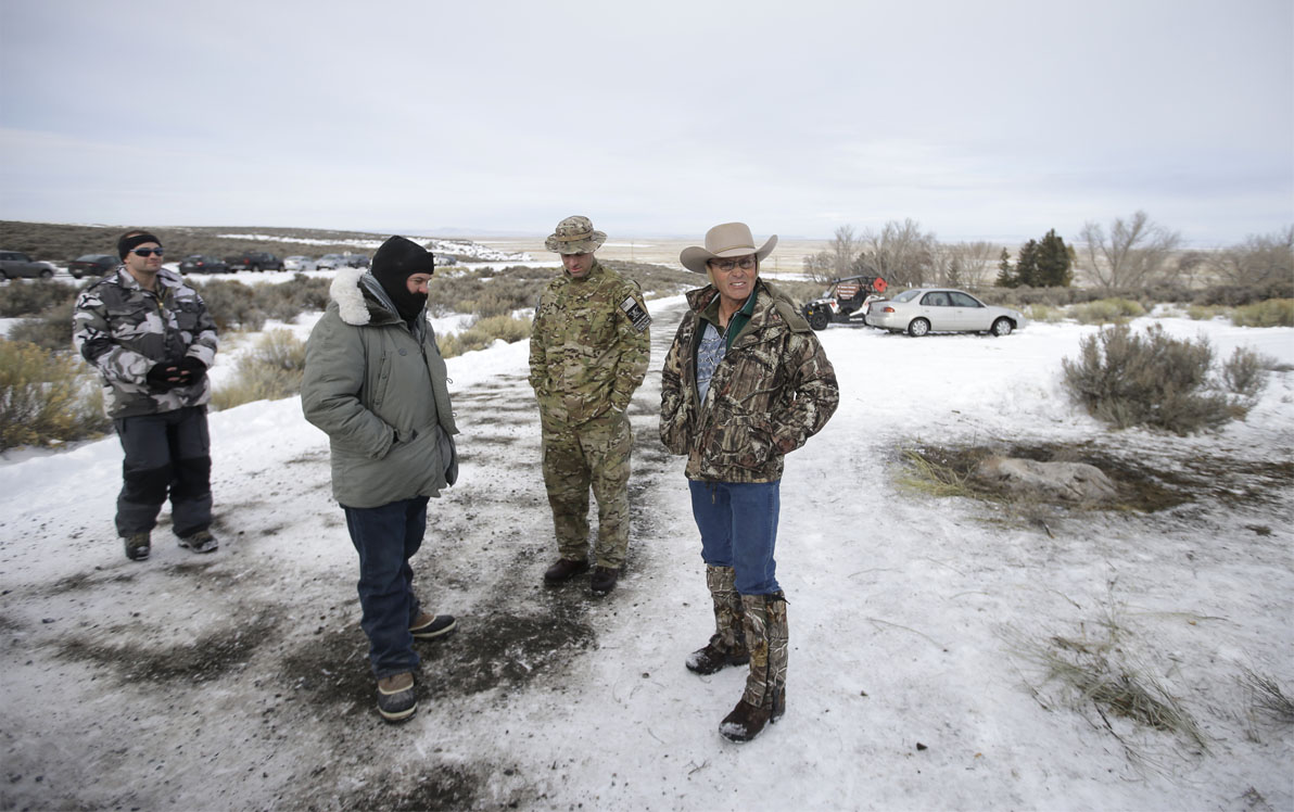 Rechterfoto: LaVoy Finicum (rechts) met een aantal anderen van de groep in het afgelegen en uitgestrekte gebied rond de Malheur National Wildlife Refuge.