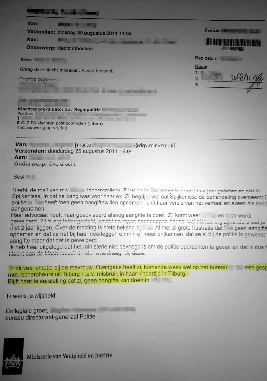In de zomer van 2011 worden er diverse keren afspraken gemaakt om aangifte te doen vanwege het seksueel misbruik binnen het pleeggezin, maar die worden tot 3 keer toe afgezegd, omdat de politie van de woonplaats waar ze dan woont weigert om samen te werken met de zedenpolitie van Midden-Brabant. [8] [9] [10]