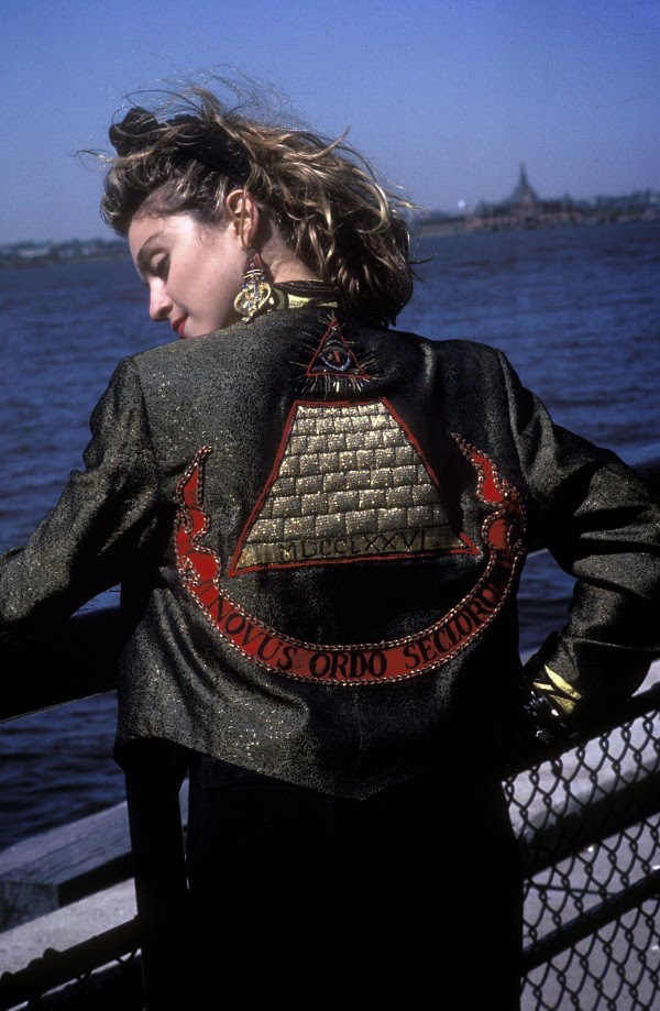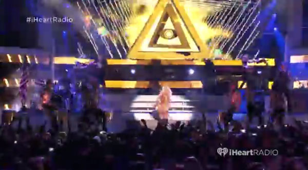 Veel artiesten laten zich fotograferen met het alziende oog handgebaar, of symbool van de piramide met het alziende oog. Hierboven Beyoncé (links) en Madonna (rechts). Ook de decors op de podia van allerlei popmanifestaties bevatten vaak dezelfde symboliek.