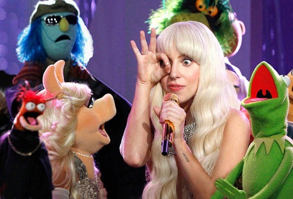 Lady Gaga in Muppet show, alziende oog en 666 handgebaar.