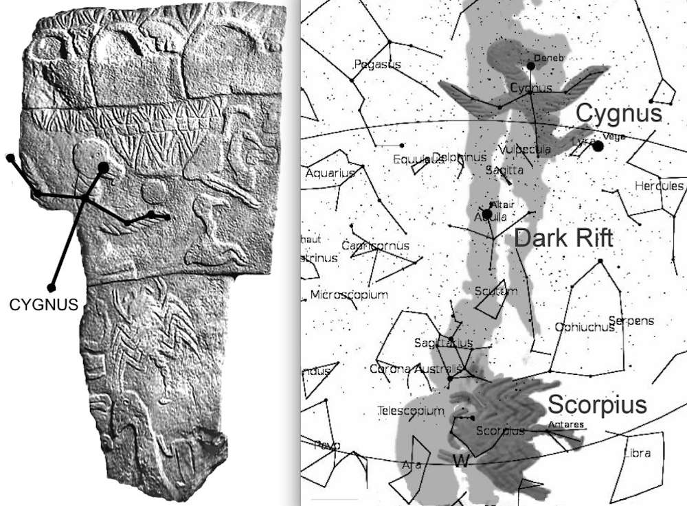 Ook historicus Graham Hancock heeft de symbolen op de Gier-zuil bestudeerd en hij gebruikt astrologische computersoftware om zorgvuldige berekeningen te maken wat de stand van de sterren, de zon, het galactische centrum en de Grote Rift is geweest op specifieke periodes in de geschiedenis, tijdens de winter- en zomerzonnewende en lente- en herfst-equinox. Daarbij komt hij tot de verbluffende conclusie dat de zon uitgerekend in ons tijdperk, binnen een tijdsbestek van 80 jaar, tijdens de winterzonnewende op 21 december precies in het huis van de Boogschutter staat. Deze periode loopt van 1960 tot 2040. Bovendien is de zon op die datum uitgelijnd met de Grote Rift in het centrum van ons Melkwegstelsel. De zon valt, vanaf de aarde gezien, precies samen met het galactische centrum, zoals de roos samenvalt in de loop van een geweer. [2]