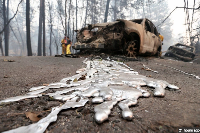 De temperaturen van de branden zijn vele malen hoger dan reguliere bos- of huisbranden. Zo heet dat metalen in bijvoorbeeld de auto’s gesmolten zijn. Foto’s bevestigen dit.