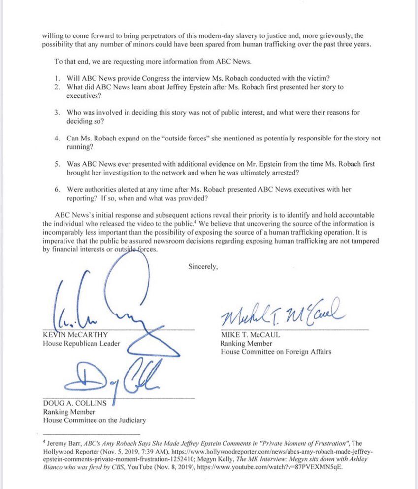 Dat de onthullingen over het handelen ABC News nog een staartje kunnen krijgen blijkt uit de brief van het Huis van Afgevaardigden die aan de nieuwszender is gestuurd om opheldering over de verduistering van het nieuwsitem te verkrijgen. Wanneer ABC News destijds geen stappen heeft genomen om met de informatie over Epstein naar de autoriteiten te gaan, zou dit wel eens hele vervelende consequenties voor de ABC kopstukken kunnen hebben.