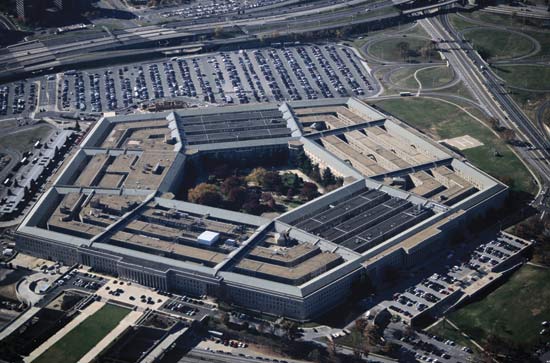Illuminati-symbolen zijn terug te vinden in de architectuur, stratenplan van steden zoals Washington DC, het Amerikaanse bankbiljet, emblemen, logo’s en zelfs in de entertainmentindustrie. Hierboven het Pentagon (links) dat onder invloed staat van de Farnese familie, die in een vijfhoekig kasteel wonen (rechts).