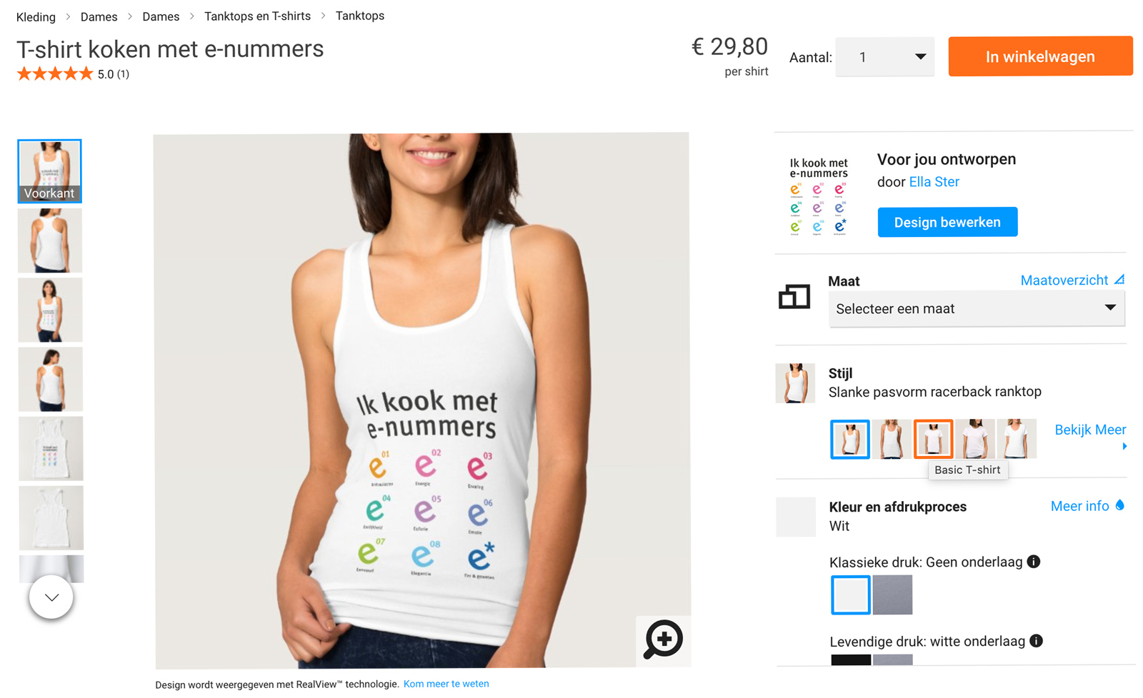 Het leuke van Zazzle is dat je op basis van de bedrukking, keuze hebt uit verschillende modellen. Zo kun je de print op verschillende producten laten drukken en met een druk op de knop wisselen van kleur, model en heren- of damesshirt. Je ziet dan meteen het resultaat.