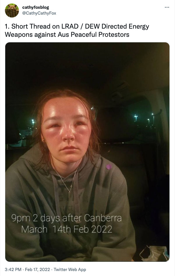 Australische demonstranten uit Canberra deelden op social media beelden van brandwonden en zwellingen die het gevolg zouden zijn van Directed Energy Weapons. Simon Parkes schreef: “Het is nu duidelijk geworden dat de politie microgolfenergie heeft gebruikt om demonstranten op meer dan één locatie uiteen te drijven. Dit wapen, dat in de Obama-jaren op grootschalige wijze is gedistribueerd, vond zijn weg naar een aantal Deep State-landen. Nu gebruiken ze het tegen de vrijheidsdemonstraties.”