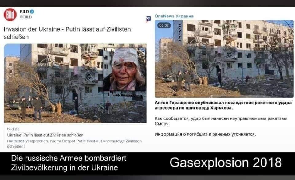 De oorlogspropaganda tegen Rusland en Putin is losgebarsten, met schokkende videobeelden van gebombardeerde steden, bebloede slachtoffers en rokende puinhopen. Dit alles zou moeten bewijzen dat Putin zich schuldig maakt aan aanvallen op de Oekraïense burgerbevolking. Bild Live zond op donderdagochtend 24 februari beelden uit van explosies, met pakkende headlines zoals: “Rusland bombardeert Oekraïne”, “Putin wil het Tsarenrijk terug” en “Putin beveelt militaire operatie”. De getoonde oorlogsbeelden blijken echter beelden te zijn uit 2015 van explosies in Tianjin China. Ook toont de Duitse tv-zender beelden van parachutisten tijdens een militaire oefening in Rusland, die in maart 2014 plaatsvond.