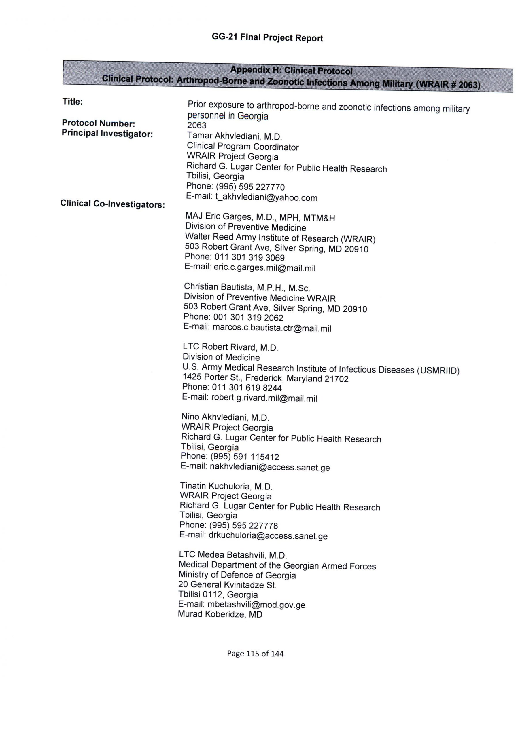 Het Pentagon heeft een 5-jarig project gelanceerd met een mogelijke verlenging van maximaal 3 jaar, met codenaam GG-21: “Door geleedpotigen (zoals insecten, spinnen en duizendpoten – red.) overgedragen en zoönotische infecties onder militair personeel in Georgië”. Zoönotische ziekten zijn infectieziekten die van nature overdraagbaar is van gewervelde dieren op mensen. Volgens de beschrijving van het project zullen er van 1.000 militaire rekruten tijdens hun lichamelijk onderzoek, onderdeel van de militaire registratie, bloedmonsters worden genomen in het Georgische militaire hospitaal in Gori.