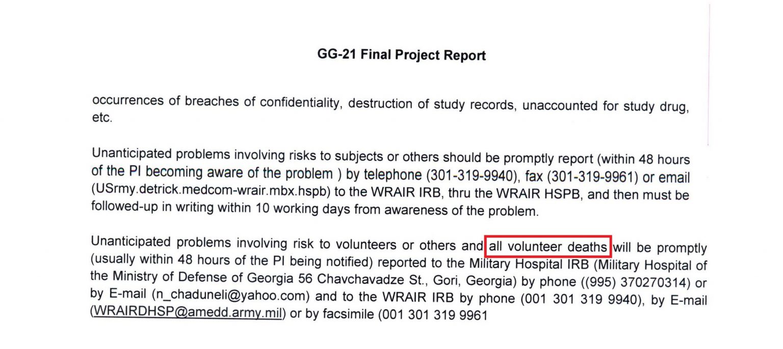 Een dergelijke procedure kan niet tot de dood leiden. Volgens het projectrapport zullen echter “alle sterfgevallen door vrijwilligers onmiddellijk – meestal binnen 48 uur nadat de hoofdonderzoeker op de hoogte is gesteld” – worden gemeld aan het Georgische Militair Hospitaal en WRAIR, VS.