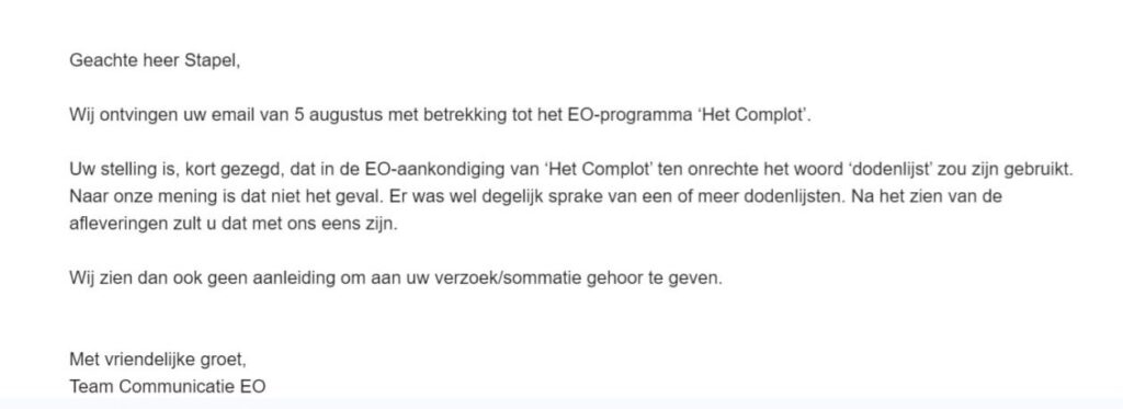 Chris Klomp die ook in de docuserie aan het woord komt, schreef op X: “Ik heb de makers van de docu (Het Complot, red) leren kennen en het zijn integere mensen die een mooie documentaire (in vier delen) hebben gemaakt.”