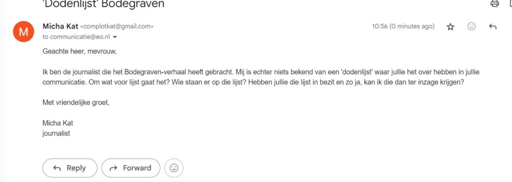 In de vooraankondiging van de EO wordt melding gemaakt van “ernstige bedreigingen” en “een dodenlijst”, die in de docu in een verband zou worden gebracht met uitlatingen in de Bodegravenzaak. Volgens Knevel is dat verband nooit aangetoond. Ook Micha Kat, die in 2020 als eerste met Knevels verhaal naar buiten kwam en later wegens opruiing is veroordeeld, vroeg de EO via zijn advocaat Thijs Stapel om opheldering over de aangehaalde ‘dodenlijst’.