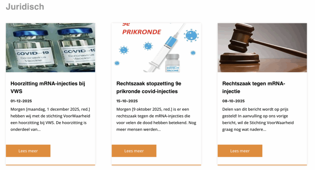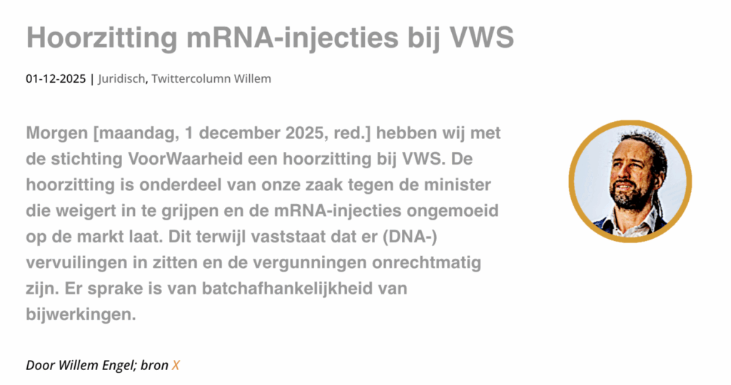De nieuwe poging van VoorWaarheid om nog meer prikschade te voorkomen en mensenlevens te redden, leidt van het kastje naar de muur. Al jaren vragen VoorWaarheid voorzitter Willem Engel, voormalig advocate Maria-Louise Genet en voormalig griffier Jacob van der Veer rechters en instanties keer op keer om (tijdelijke) opschorting van de experimentele gen-therapeutische Covid-19 injecties. Tijdens een online hoorzitting tegen de Minister van VWS op 1 december 2025, draagt het drietal cijfers, feiten en wetten aan om de jarenlange oversterfte een halt toe te roepen, en aandacht te vragen voor de vele slachtoffers en bijwerkingen. Tevergeefs, bleek opnieuw.