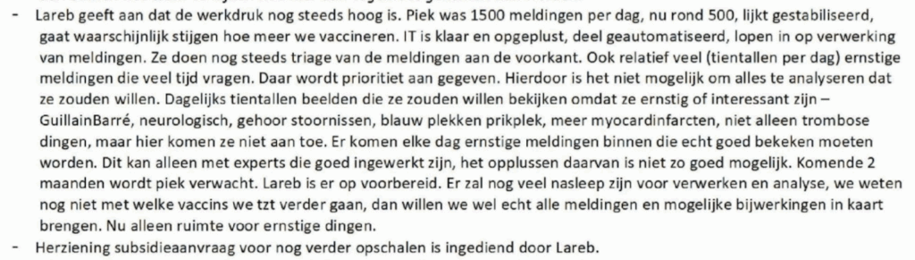 Belangrijk is ook het rapport uit oktober 2022 van de Commissie Genetische Modificatie (COGEM). Deze Commissie valt onder het domein van het Ministerie van Infrastrutcuur & Waterstaat. In hoofdtuk 3 van het COGEM-rapport wordt bevestigd dat de prikken een GGO-product zijn en dat de milieurisicobeoordeling dus nooit had mogen worden opgeschort. De waarborgen uit het Verdrag van Aarhuus zijn er niet voor niets: GGO’s kunnen gevaarlijk zijn voor mens en milieu en dienen uitvoerig getest te worden. Door deze regels overboord te zetten door middel van Verordening 2020/1043/EU heeft het gevaar – waarvoor de Stichting al vanaf dag 1 waarschuwt – zich ook daadwerkelijk verwezenlijkt. De voorspellingen die het LAREB in mei 2020 deed, in het Draaiboek Veiligheidsbewaking Corona-pandemie, zitten een factor zeventien naast de werkelijkheid. Het LAREB schatte namelijk dat er 15.000 meldingen zouden binnenkomen, waarvan 600 ernstig, maar inmiddels staat de teller op ruim 236.000 meldingen, waarvan ruim 6.300 ernstig.